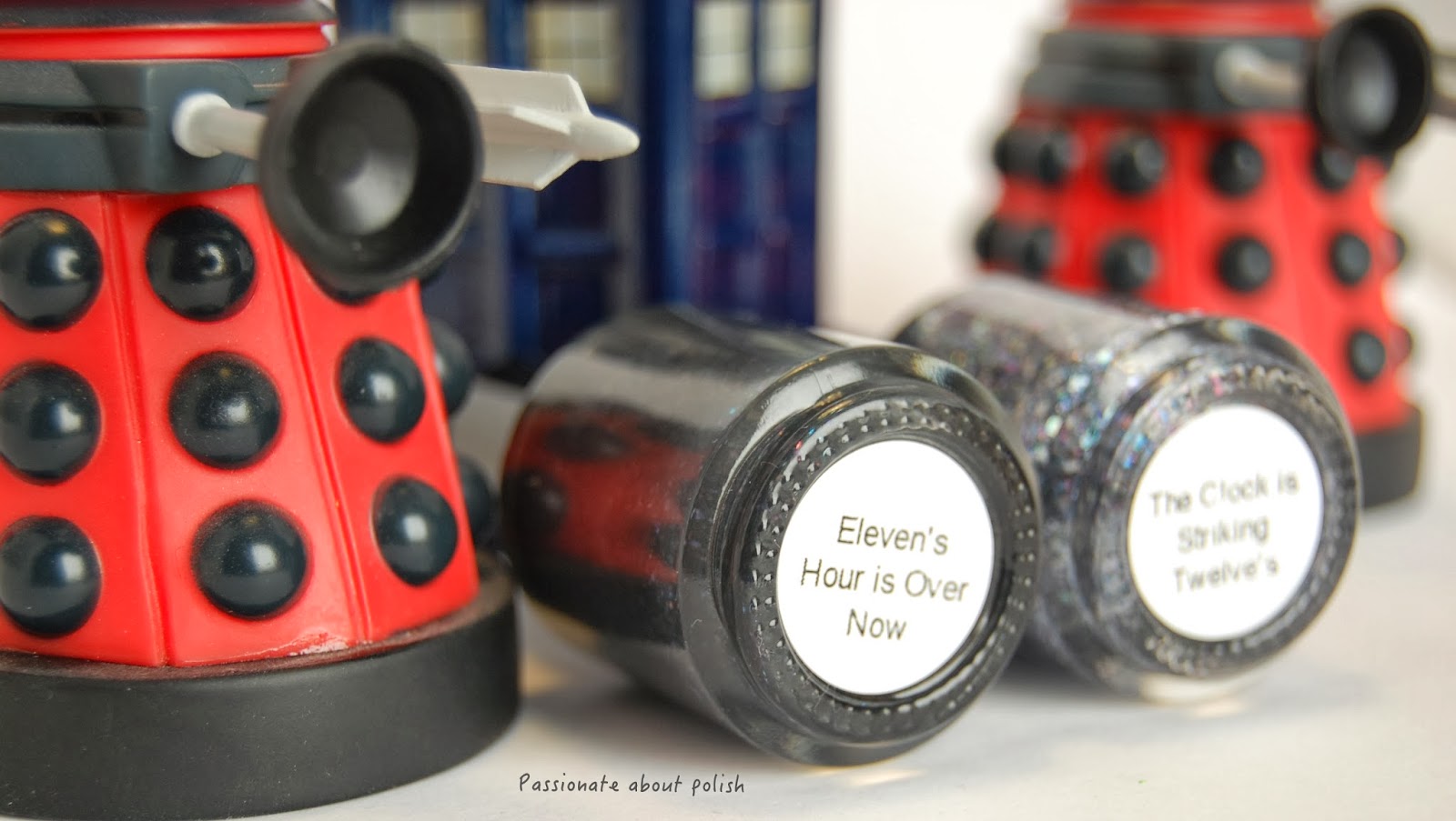 It's time for the DW inspired January duo from Pahlish. It consists of two polishes a cream, Eleven's hour is over now, and a glitter topper, The clock is striking twelve's.